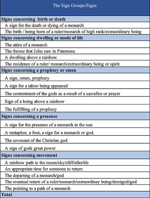 The signs are very numerous, as are the omens of all the rainbow types within the traditional Hawaiian stories/legends, and within some of the other references as well. These were all collected together, and they formed the beginning of a list. The result, there are 21 signs/omens on the list shown below on the right (translation on the left).[1] In the left column, the source of each of these is shown. If they these signs/omens are examined closely, some are very similar. Therefore, these were grouped together within 5 groups. This grouping allows for easier analysis and comparison of the signs/omens within and between the groups.